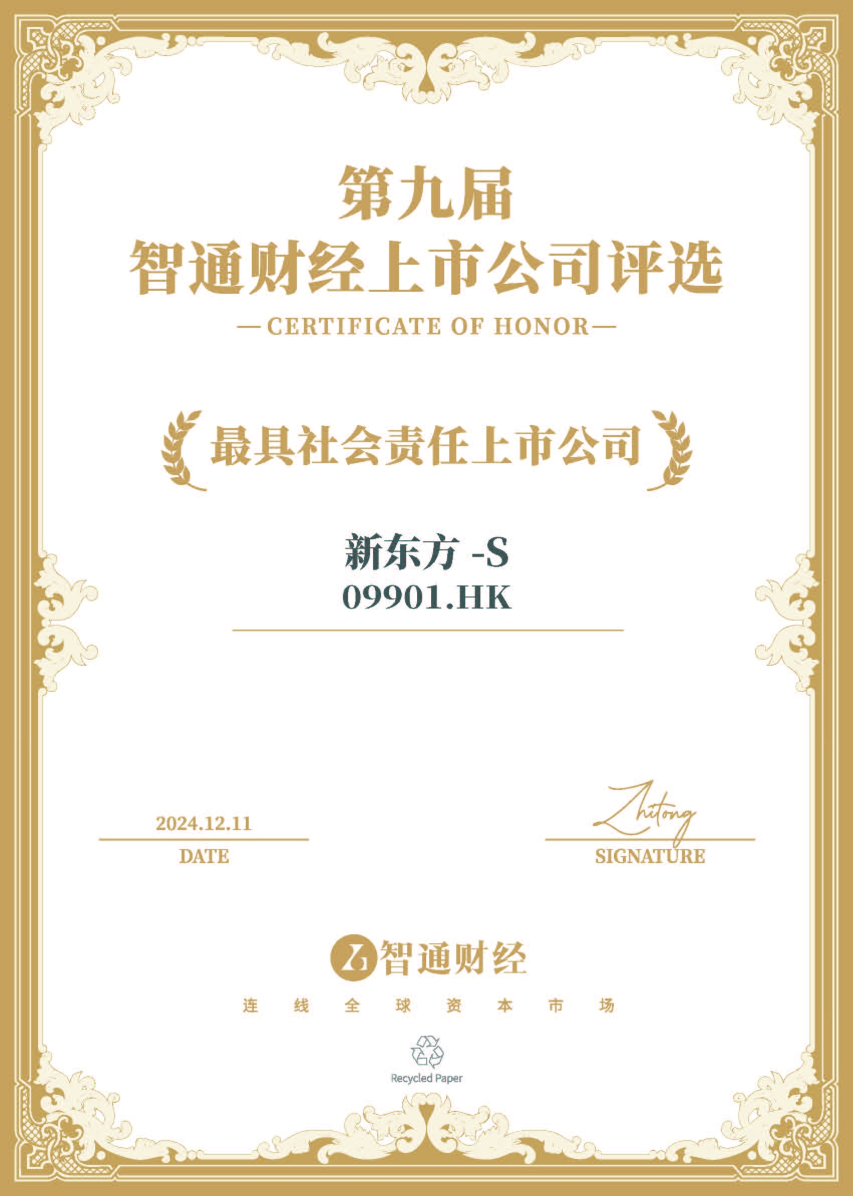 2024年12月11日,新东方-S(09901)在备受瞩目的“第九届智通财经资本市场年会暨上市公司颁奖典礼”上荣获“最具社会责任上市公司”。这一盛会由国内领先的港美股资讯平台智通财经与中资海外私募基金一站式服务平台新智基金网联合主办,并由财经公关综合服务提供商冬日暖阳Donova独家承办,同时得到了专业财经路演直播平台“大路演”提供的路演支持。
