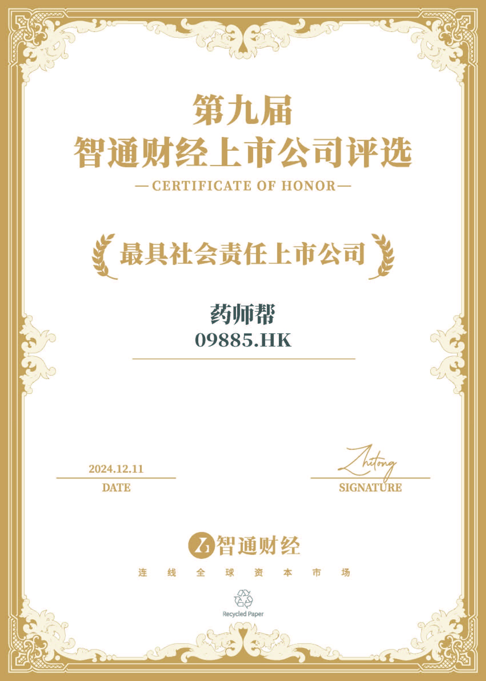 2024年12月11日,药师帮(09885)在备受瞩目的“第九届智通财经资本市场年会暨上市公司颁奖典礼”上荣获“最具社会责任上市公司”。这一盛会由国内领先的港美股资讯平台智通财经与中资海外私募基金一站式服务平台新智基金网联合主办,并由财经公关综合服务提供商冬日暖阳Donova独家承办,同时得到了专业财经路演直播平台“大路演”提供的路演支持。