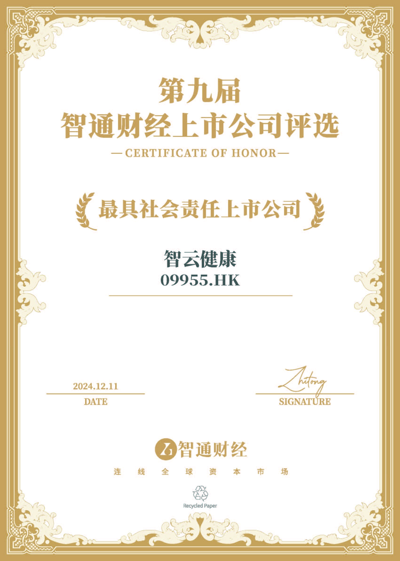2024年12月11日,智云健康(09955)在备受瞩目的“第九届智通财经资本市场年会暨上市公司颁奖典礼”上荣获“最具社会责任上市公司”。这一盛会由国内领先的港美股资讯平台智通财经与中资海外私募基金一站式服务平台新智基金网联合主办,并由财经公关综合服务提供商冬日暖阳Donova独家承办,同时得到了专业财经路演直播平台“大路演”提供的路演支持。