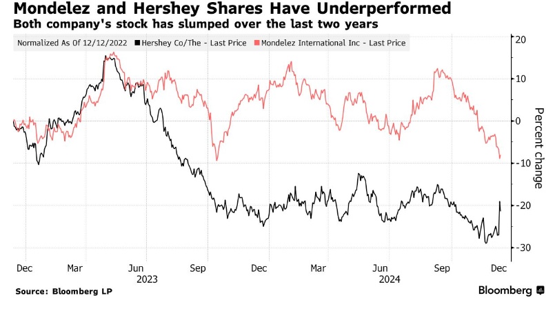 现在,一系列因素可能将使得这笔交易对两家零食行业重要参与者都更具吸引力。今年,可可期货价格飙升至历史新高,迫使巧克力制造商们不断提高价格,尽管整体食品通胀已经降温。好时公司也受到购物者减少非必须用品消费以及精打细算消费者越来越多带来的挤压。这一次,好时公司可能不会那么快地拒绝收购。股价方面,这两家公司近两年以来在通胀持续以及消费者愈发精打细算的趋势下股价均极度萎靡,大幅跑输标普500指数。