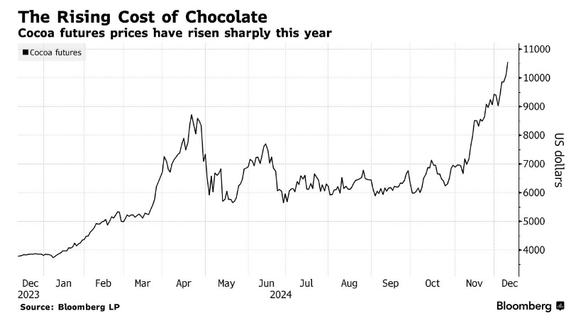 纽交所的可可期货价格一度大降温,但此后随着人们对于恶劣天气和最大种植区西非产量下降的担忧加剧,可可期货价格继续向上进攻,大幅飙升了50%以上。对于正在重建可可对冲合约以及积极补充库存的巧克力公司来说,这可能意味着更多的痛苦。