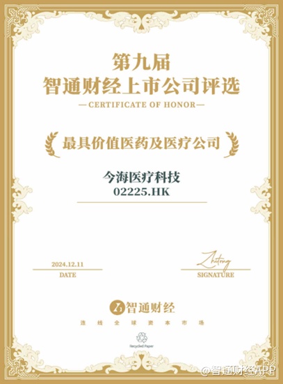 在“第九届智通财经资本市场年会暨上市公司颁奖典礼”上,今海医疗(02225)被授予“最具价值医药及医疗公司”的殊荣。作为行业内备受瞩目的企业,今海医疗以其卓越的技术创新和市场表现赢得投资者的广泛认可。