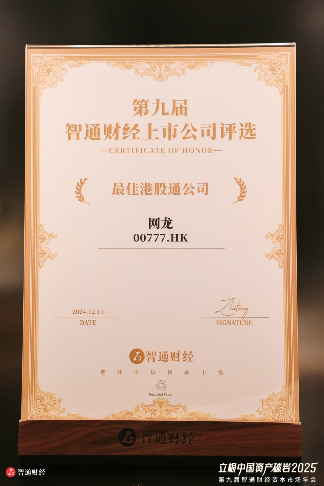 智通财经APP获悉,2024年12月11日,网龙(00777)在 “第九届智通财经资本市场年会暨上市公司颁奖典礼”上荣获“最佳港股通公司”大奖。