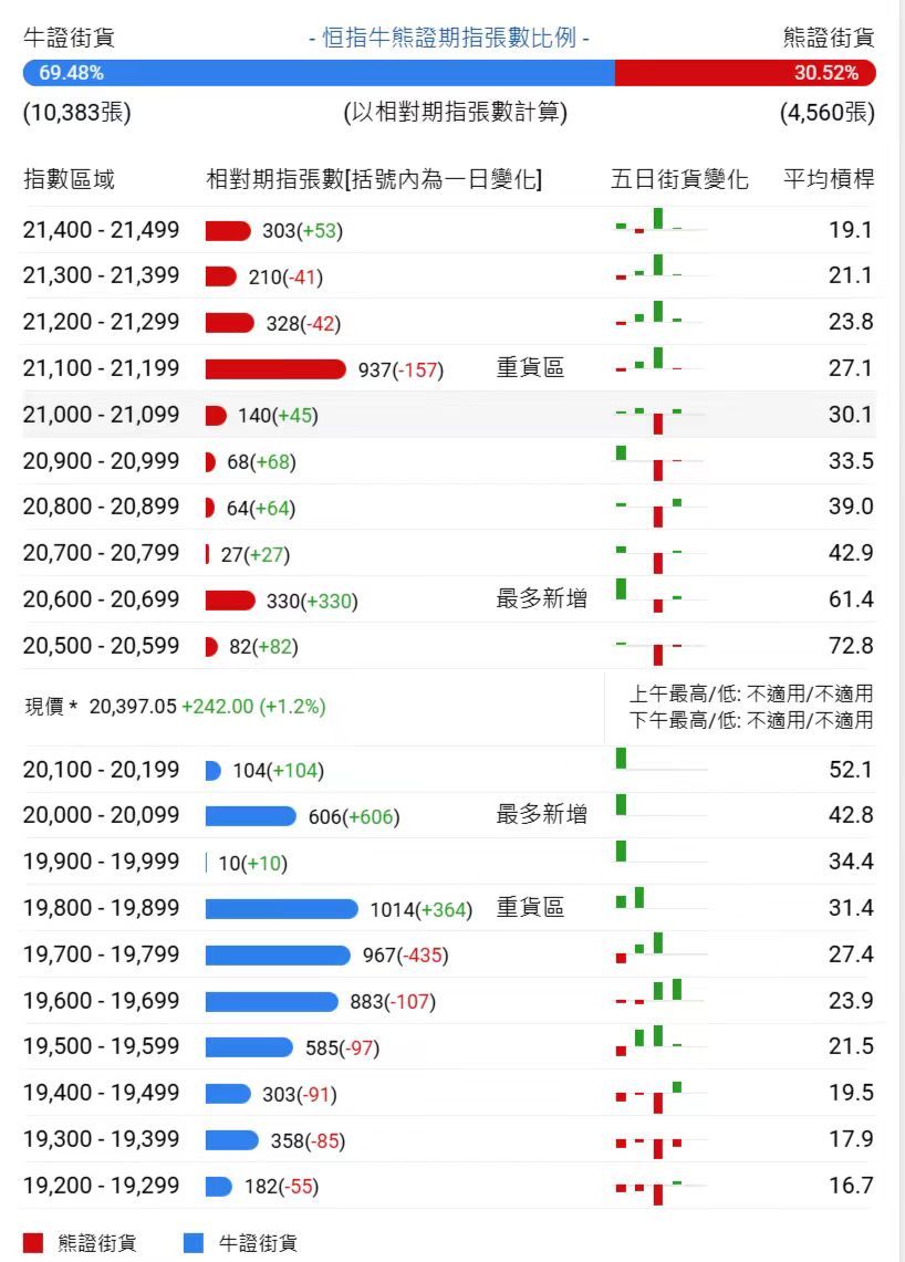 中信证券牛熊证街货分布图中的数据显示,熊证街货重货区在21100-21199区间,该区间最新熊证数量为937张,较上一交易日减少157张;最多新增在20600-20699区间,该区间最新熊证数量为330张,较上一交易日增加330张。