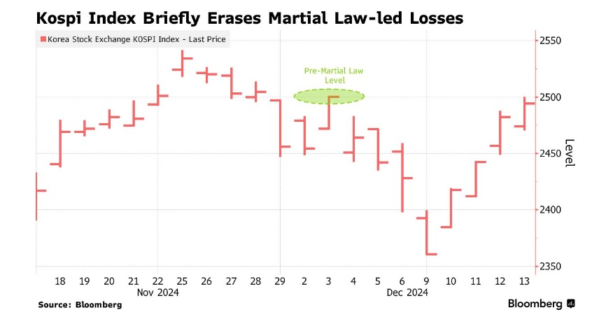 智通财经APP获悉,韩国股市基准指数周五攀升,从韩国总统尹锡悦“闹剧般”实施“韩国紧急戒严令”所引发的所有指数下跌损失中实现恢复,收复戒严令以来的所有跌幅。周五,韩国基准股指——Kospi综合股价指数上涨0.5%,连续四天上涨。该指数徘徊在12月3日收盘水平上方,当时尹锡悦在韩国时间深夜突然间宣布紧急戒严命令,震惊整个韩国,韩国股债汇大幅走弱,但是尹锡悦几小时后便宣布撤销该戒严命令。
