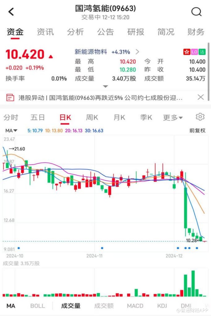 12月5日以来,国鸿氢能(09663)股票遭遇了新一轮集中抛售。