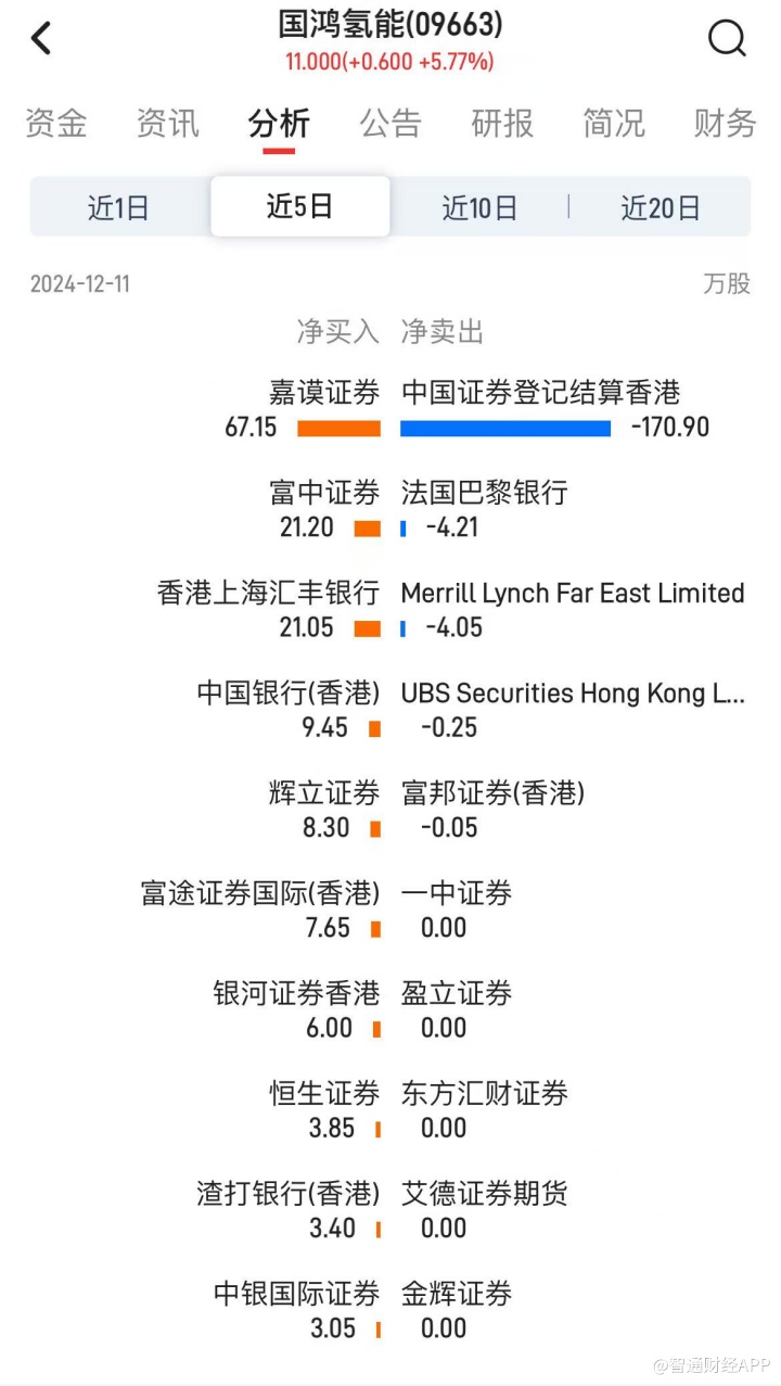 智通财经APP数据显示,从经纪商买卖席位上看,截至12月11日的近5个交易日,卖方前三分别为中国证券登记结算香港、法国巴黎银行和MerrillLynch Far East Limited,分别净卖出170.9万股、4.21万股、0.25万股;买方前三为嘉谟证券、富中证券、香港上海汇丰银行,分别净买入67.1万股、21.20万股、21.05万股。由此可见,中国证券登记结算香港的席位主导了国鸿氢能近期股价大跌。