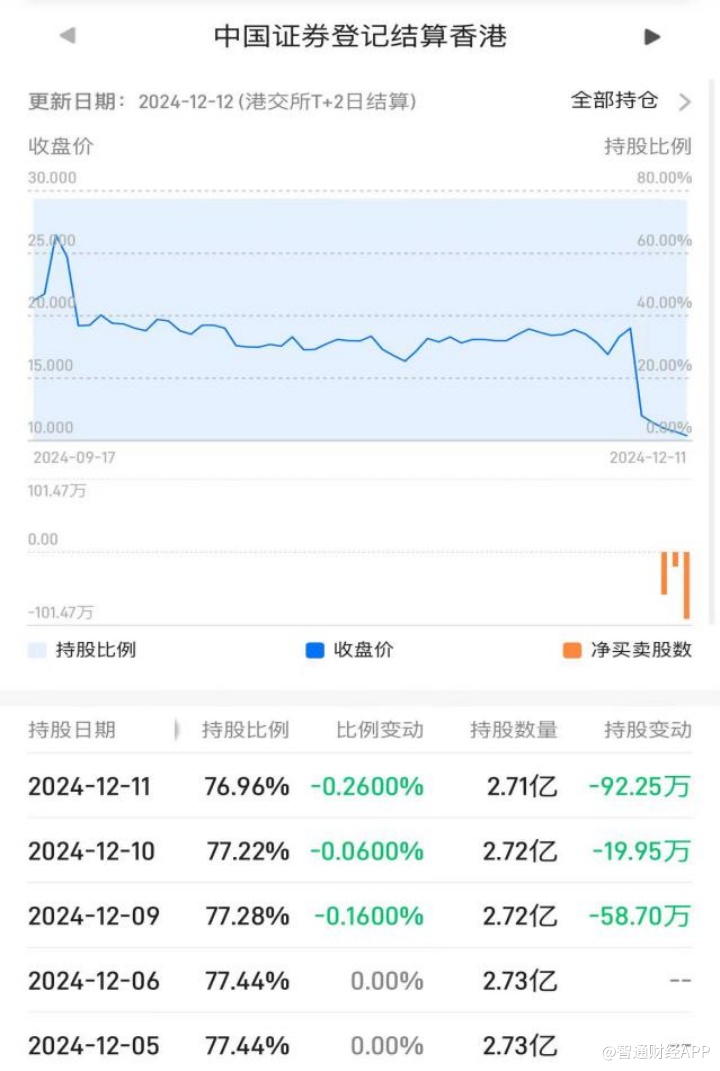 具体来看,12月9-11日三个交易日,中国证券登记结算香港席位分别净卖出国鸿氢能58.7万股、19.95万股、92.25万股。截至12月11日,中国证券登记结算香港席位持有国鸿氢能2.71亿股,持股比例76.96%。