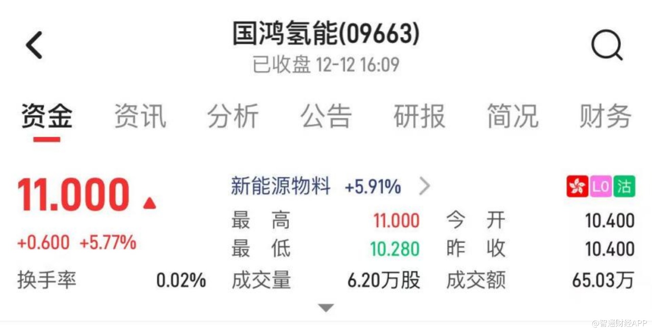 成交量方面,12月5-12日期间6个交易日,国鸿氢能的累计成交量为300.3万股,成交金额为3488万港元。12月5日,国鸿氢能成交96.85万股,成交金额1203万港元,成交量较前期显著放大。12月9日,投资者“抄底”热情达到高峰,当日成交114.6万股,成交金额1296万港元。