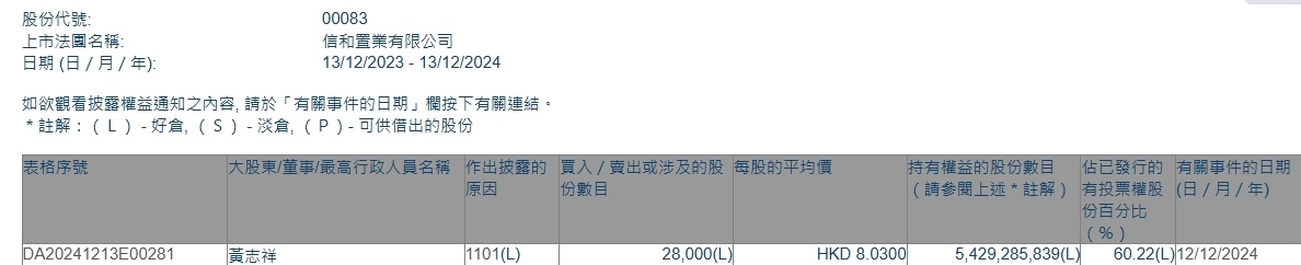 智通财经APP获悉,香港联交所最新资料显示,12月12日,董事会主席黄志祥增持信和置业(00083)2.8万股,平均每股作价为8.03港元,总金额约为22.48万港元。增持后最新持股数目约为54.29亿股,最新持股比例为60.22%。