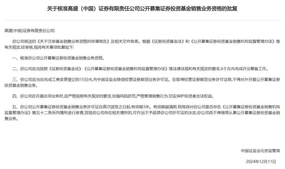 高盛(中国)证券应当按照《证券投资基金法》《公开募集证券投资基金销售机构监督管理办法》等法律法规和有关规定的要求,6个月内完成开业筹备工作。