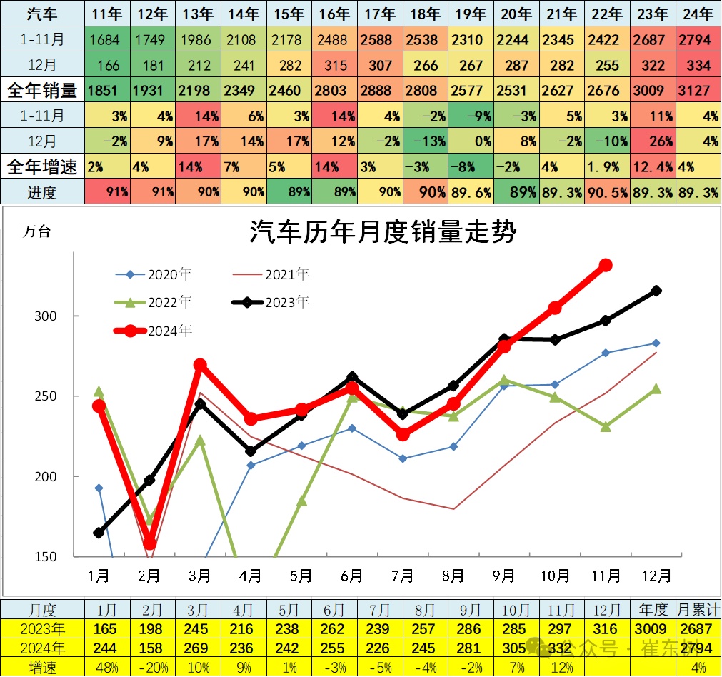 2024年1-11月累计汽车总计销量2794万台,累计增速3.9%;2024年11月份汽车总计销量332万台,同比增长12%,环比上月增长8%。