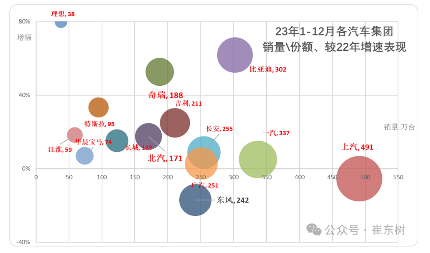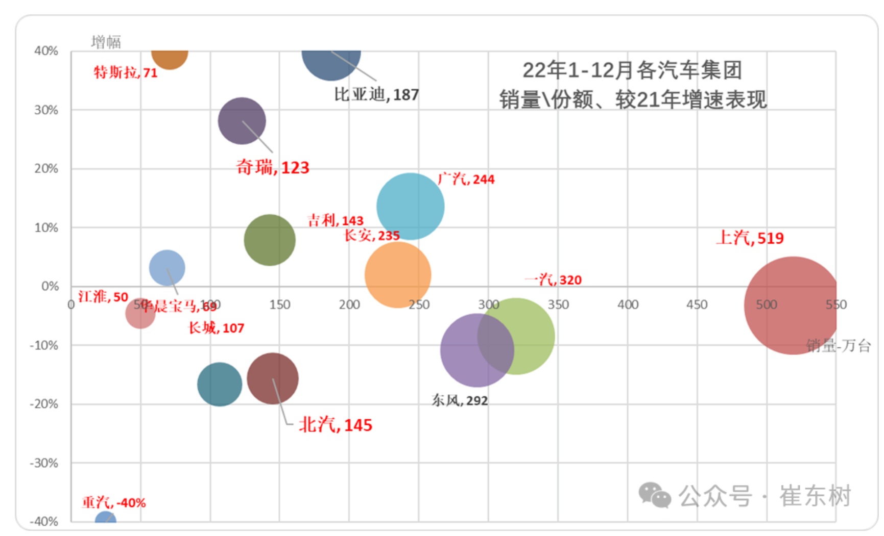 对比上面2021年图表,2022年的部分车企强势表现,行业增速分化严重。2022年年初的疫情导致传统车企压力较大,尤其新能源冲击叠加疫情影响,国有大集团表现分化,广汽和奇瑞表现优秀,其中奇瑞的商用车和乘用车版块表现均很好。北方的一汽、长城等各家表现都有压力。