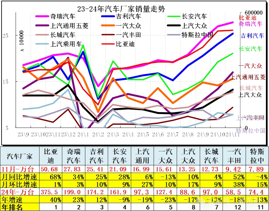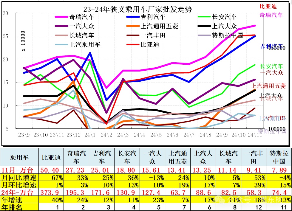 2024年的汽车集团的阵容格局全面变化,比亚迪新品降价增量,由于乘用车销售节奏好和海外贡献,因此奇瑞、吉利和东风表现的很好,上汽仍处于剧烈下滑中。新能源车的比亚迪和特斯拉增速分化。
