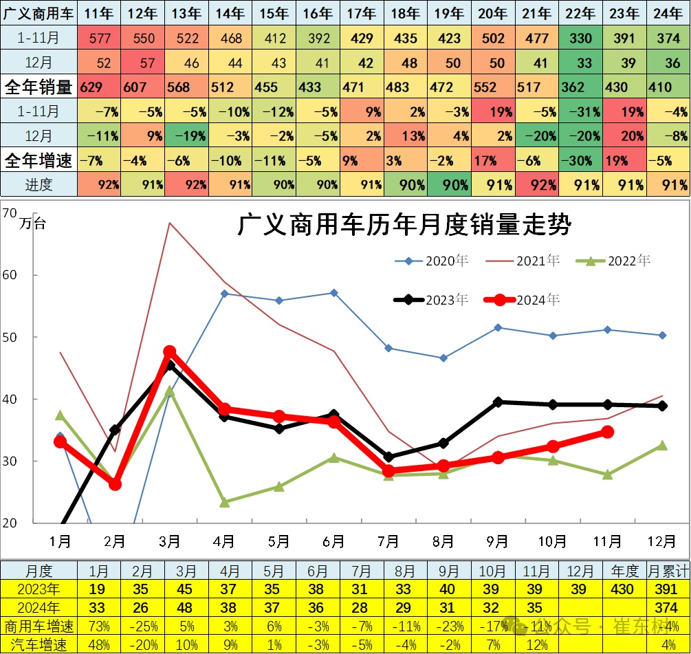 2023年全年累计厂家销量广义商用车销量429.77万台,累计增速18.6%;2024年1-11月累计广义商用车销量374.27万台,累计下降4.2%;2024年11月份广义商用车销量34.74万台,同比下降11.2%,环比上月增长7.2%。2024年开局主要是1月基数因素较强,随后高基数下的3-6月表现平稳,2024年7-11月的商用车增长较弱。