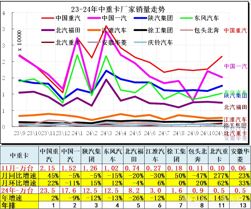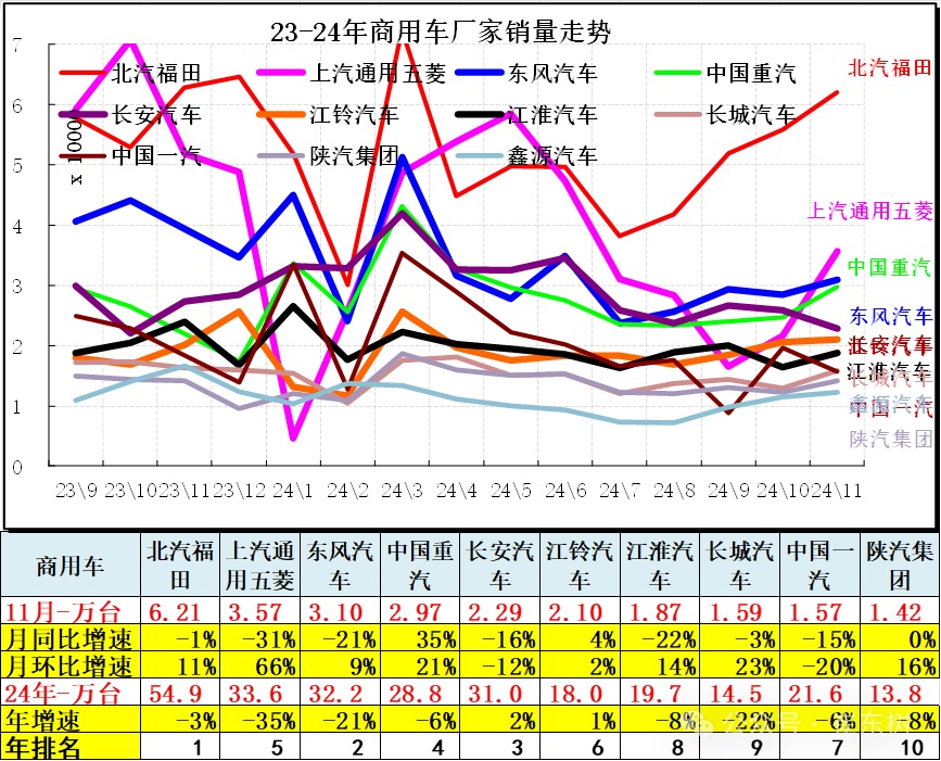 2024年的轻卡主力厂家分化较明显,吉利汽车等同比去年11月暴增。