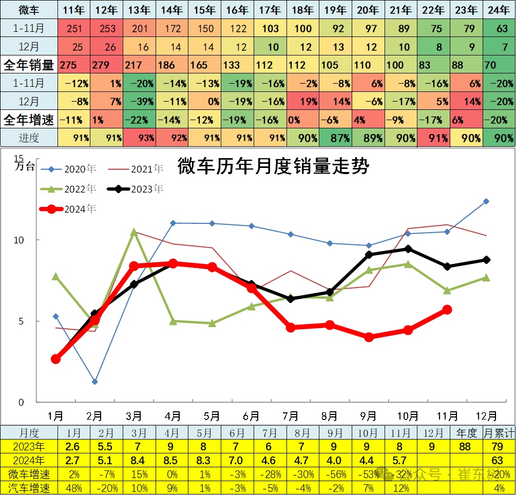 2023年全年累计厂家销量微车合计销量88.24万台,累计增速6.3%;2024年1-11月累计微车合计销量63.48万台,累计下降20.1%;2024年11月份微车合计销量5.7万台,同比下降31.8%,环比上月增长28.4%。