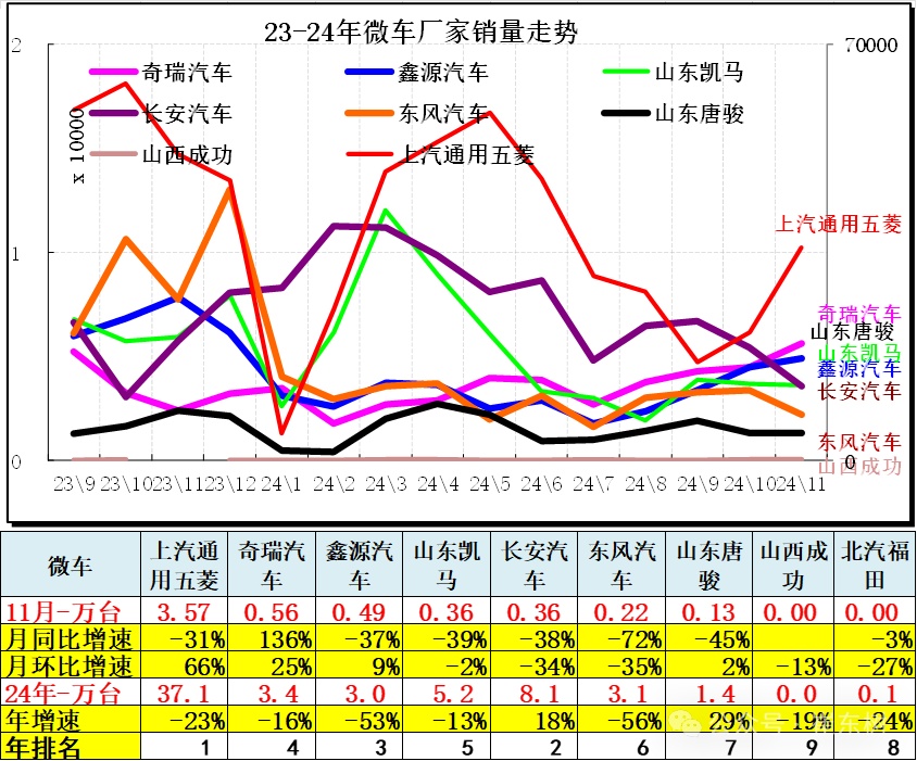 2024年1-11月累计微客销量23.74万台,累计下降1%;2024年11月份微客销量3.26万台,同比增长27.7%,环比上月增长25.9%。2024年1-11月累计微卡销量39.74万台,累计下降28.4%;2024年11月份微卡销量2.44万台,同比下降58%,环比上月增长31.9%。