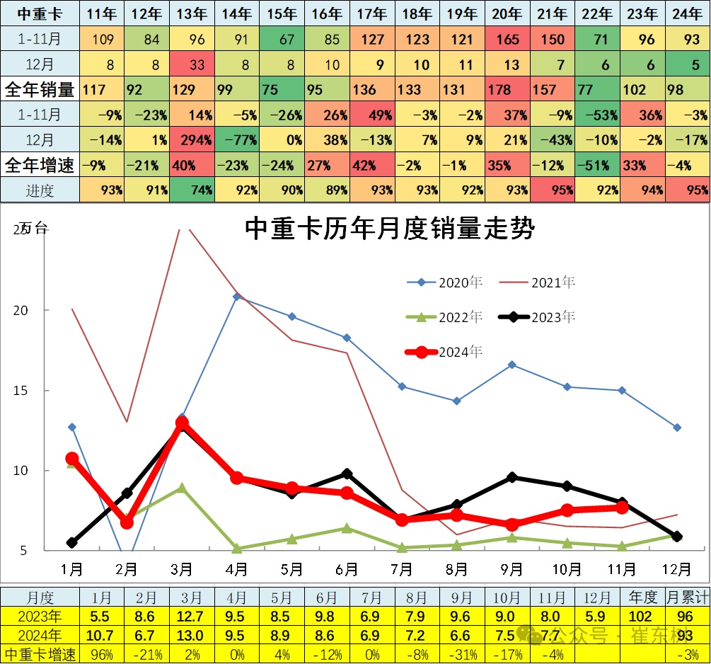 2024年1-11月累计中重卡销量93.35万台,累计下降2.7%;2024年11月份中重卡销量7.68万台,同比下降3.8%,环比上月增长2.4%。