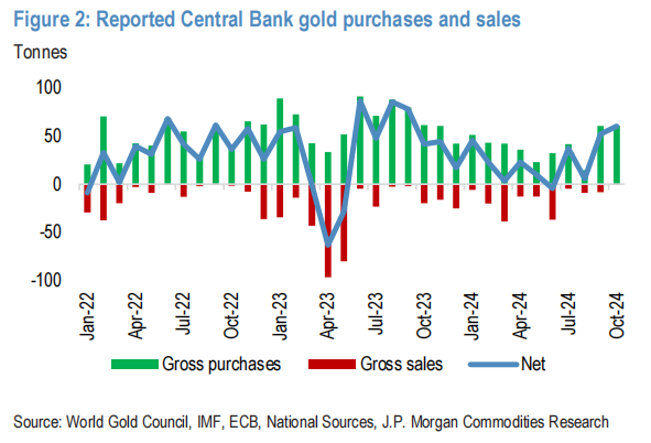 此外,继10月份央行购金活动普遍回升后,中国重返市场。中国人民银行在2024年11月增加了约5吨黄金,这是自2024年4月暂停购买以来的首次。虽然与2022年11月至2024年4月期间平均每月近18吨的购买量相比,上个月的购买相对温和,但这标志着中国在美国国债持有量持续下滑的背景下,重新开始增加黄金储备。