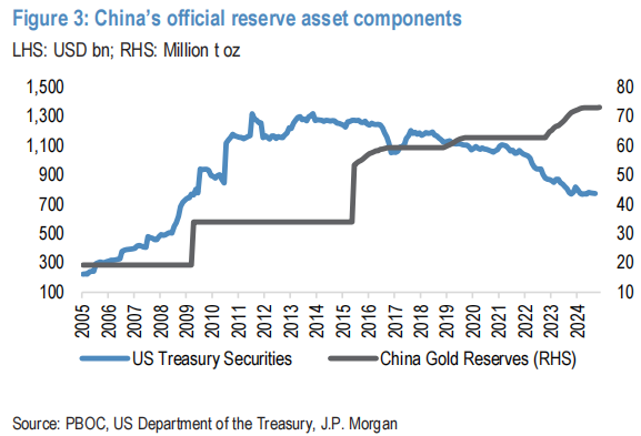 目前,中国的外汇储备中大约有23%是美国国债,远低于2010年45%的峰值。未来中国可能会进一步增加黄金储备,同时减少美国国债持有量。