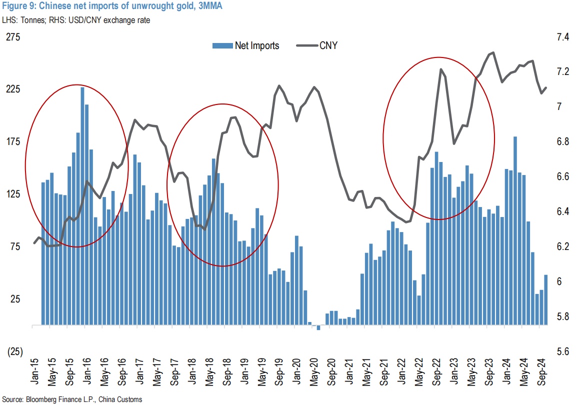 过去十年中,人民币汇率大幅波动时期往往伴随着中国强劲的黄金进口需求,包括2015/16年、2018年的贸易战1.0期间以及2022年,这一时期引发了中国和人民银行最近一轮的购金热潮。