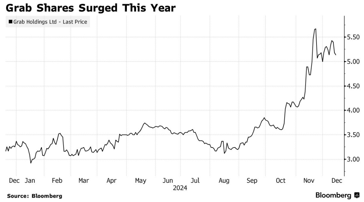 Grab 本季度股价上涨,使其成为全球同类公司中的佼佼者。如今,该公司已在东南亚叫车服务和在线食品配送销售领域占据主导地位,击败了其主要竞争对手印尼的 GoTo 集团,或许终于兑现了多年的承诺。