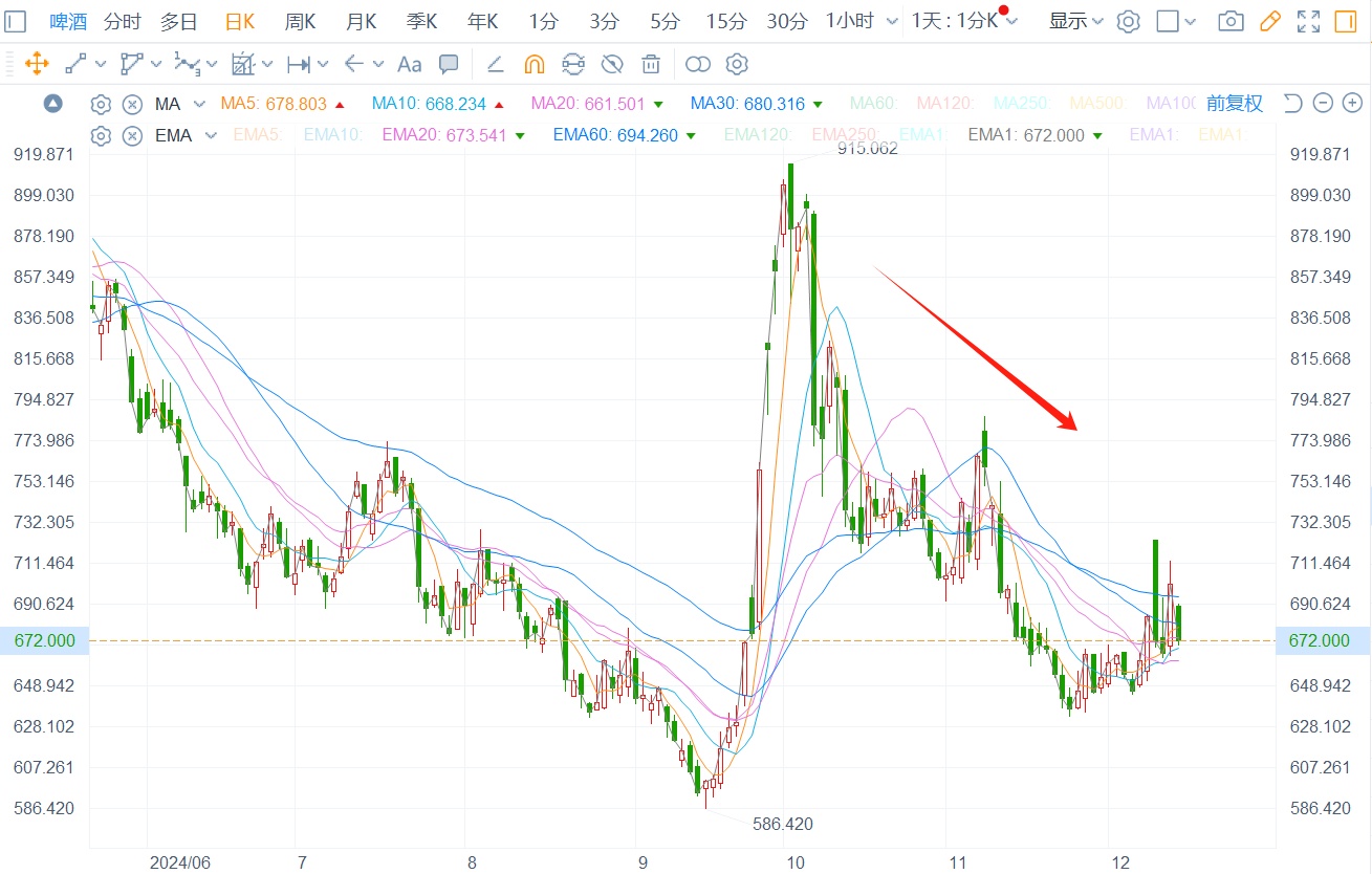 12月13日,港股啤酒板块大幅走低,盘中一度跌近5%,截止收盘该板块下跌4.09%,跌幅靠前,收于672点。拉长时间线来看,今年10月初啤酒板块达到短期高点915.062点之后,便直转向下,一路下行,截至目前该板块51交易日累跌超25%,市盈率TTM为14.97倍,处于明显低位。