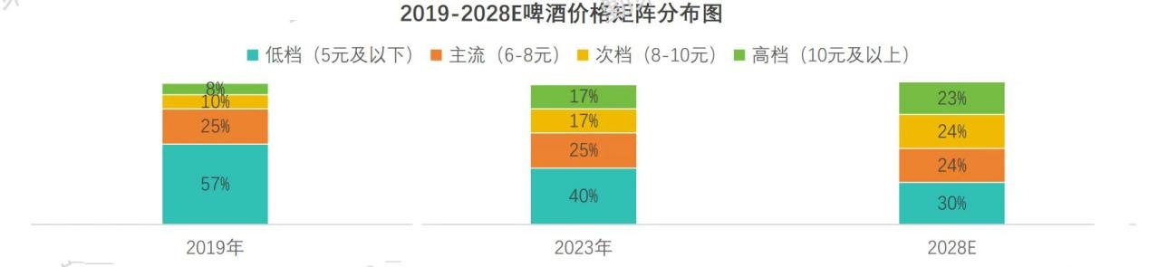 展望未来五年,啤酒市场的价格带格局将发生显著变化,8 - 10 元价格带的中档酒将逐步取代现有的 6 元价格带,这一高端化发展趋势具有较高的确定性。预计 6 元价格带的市场规模有望从当前的 600 万吨左右拓展至约 850 万吨,而 10 元及以上价格带的销量也将从 600 万吨上下扩容至 800 万吨,不过其扩容速度相较于次高档产品会稍显迟缓。