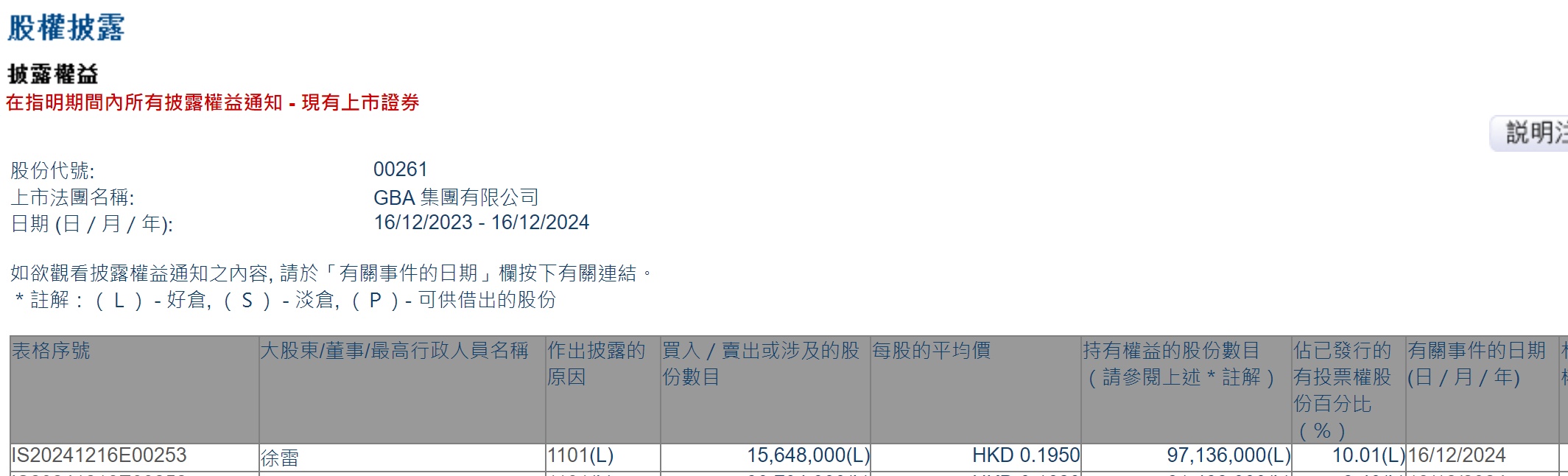 智通财经APP获悉,香港联交所最新资料显示,12月16日,徐雷增持GBA集团(00261)1564.8万股,每股作价0.195港元,总金额为305.136万港元。增持后最新持股数目为9713.6万股,最新持股比例为10.01%。