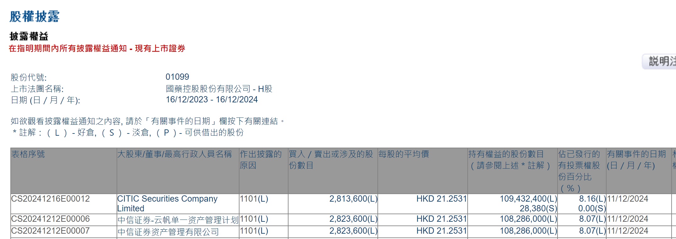 补充资料:权益为中信证券资产管理有限公司代其管理的全部资产管理计划披露持有的国药控股股份有限公司 - H股权益。