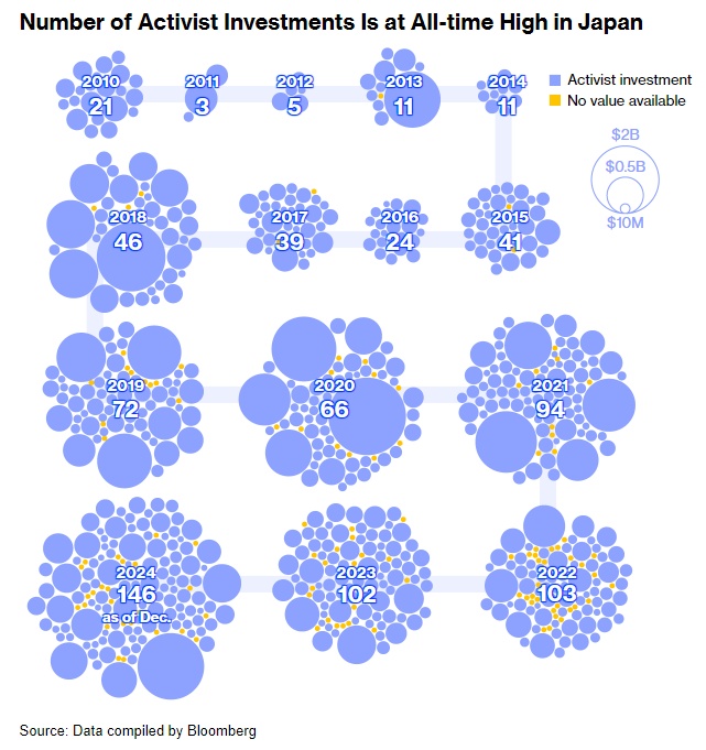 最大的单一激进投资者是Effissimo Capital Management Pte,该公司持有航运公司川崎汽船株式会社(Kawasaki Kisen Kaisha Ltd.)、保险公司第一生命保险株式会社 (Dai-ichi Life Holdings Inc.)和复印机制造商理光公司(Ricoh Co.)的大量股份。