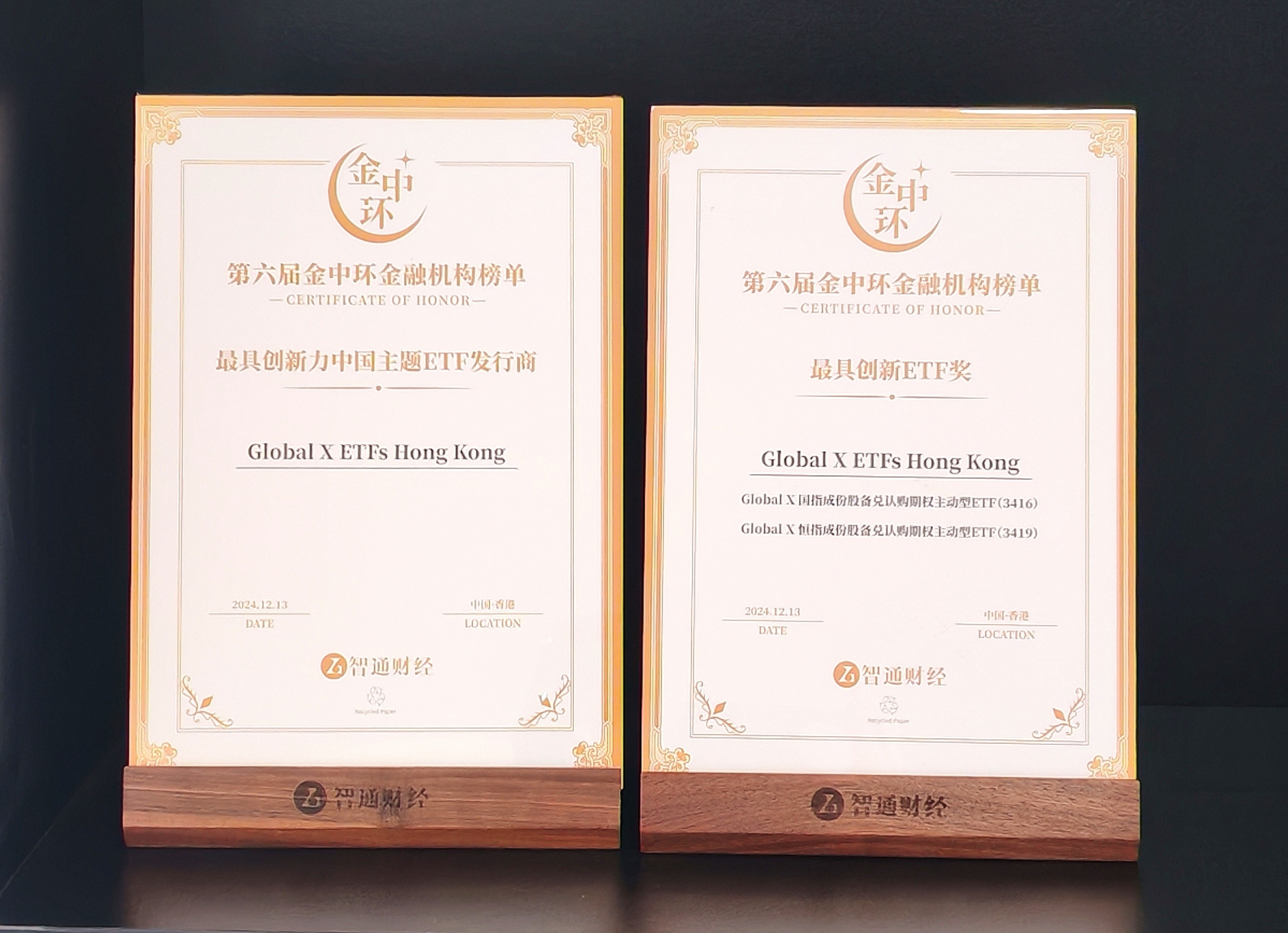 智通财经APP获悉,12月13日下午,由智通财经联合香港中资证券业协会举办的第六届“2024·金中环论坛 ·暨金融机构榜颁奖典礼”在香港中环圆满举行。会上重磅揭晓了第六届“金中环”金融机构榜单。Global X ETFs Hong Kong凭借上市众多多元化中国主题ETF产品以及成功发行香港市场首两支备兑认购期权策略ETF,从众多参评机构中脱颖而出,荣膺“最具创新力中国主题ETF发行商”和“最具创新ETF奖-Global X 国指成份股备兑认购期权主动型ETF(03416)、Global X 恒指成份股备兑认购期权主动型ETF(03419)”。