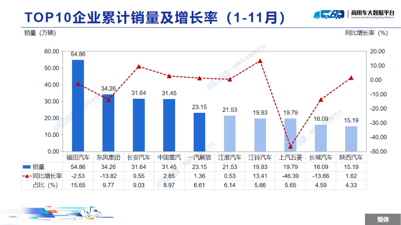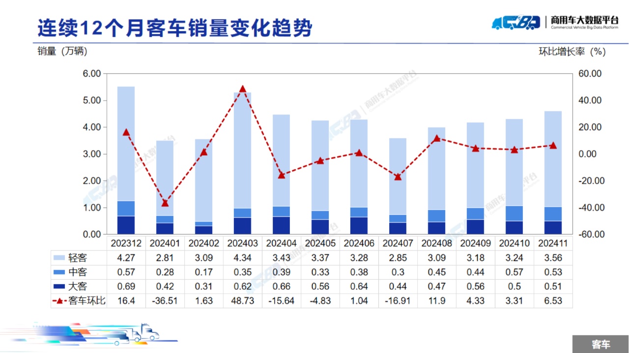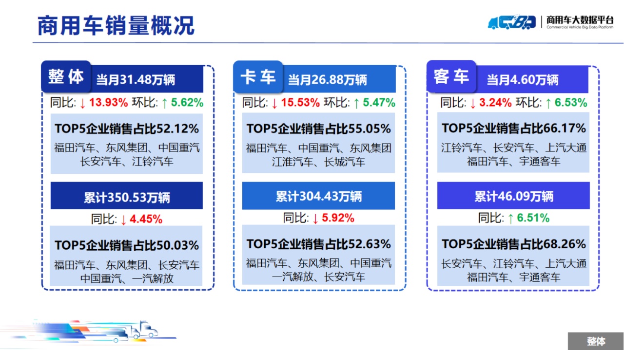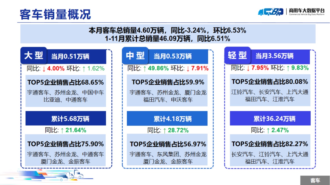 2024年1-11月全国商用车累计销量(批发)为350.53万辆,同比下降4.45%。其中卡车累计销量为304.43万辆,同比下降5.92%;客车累计销量为46.09万辆,同比上涨6.51%。