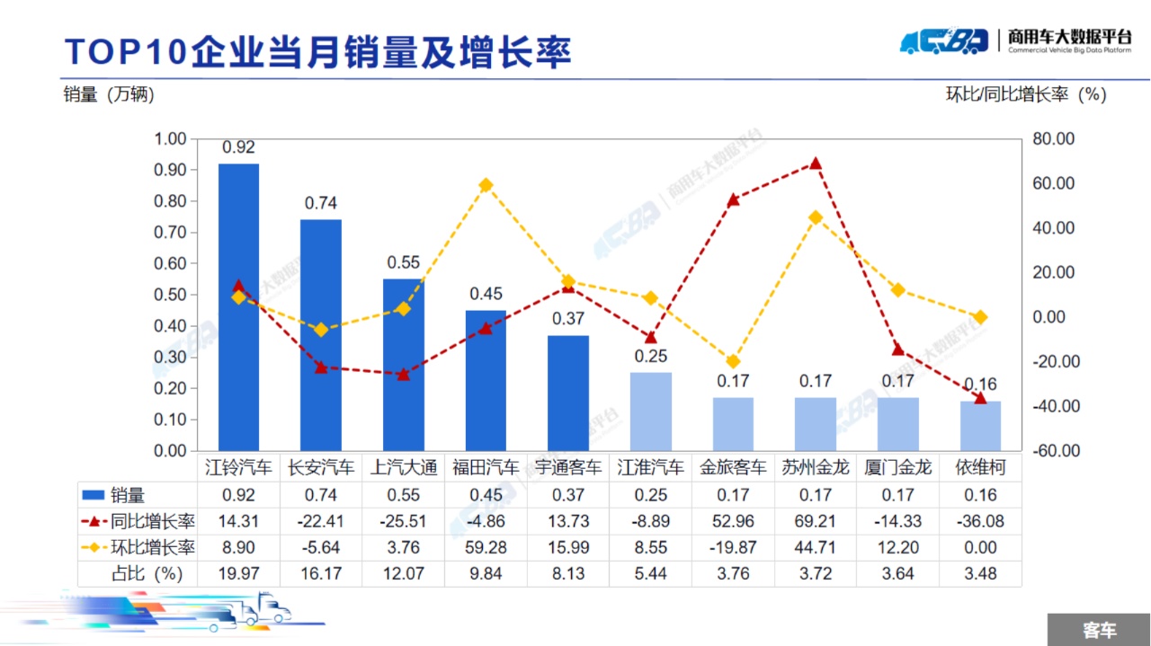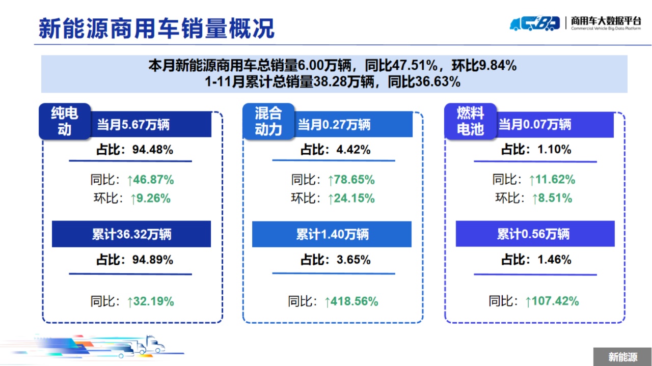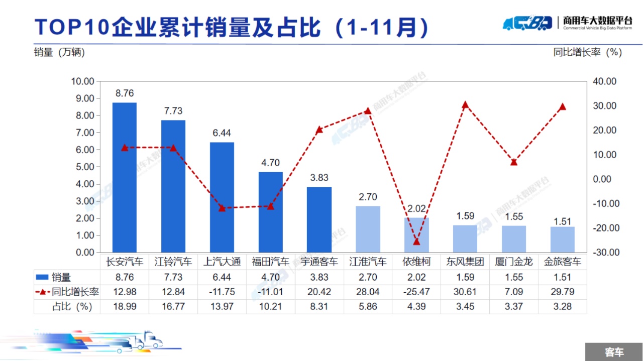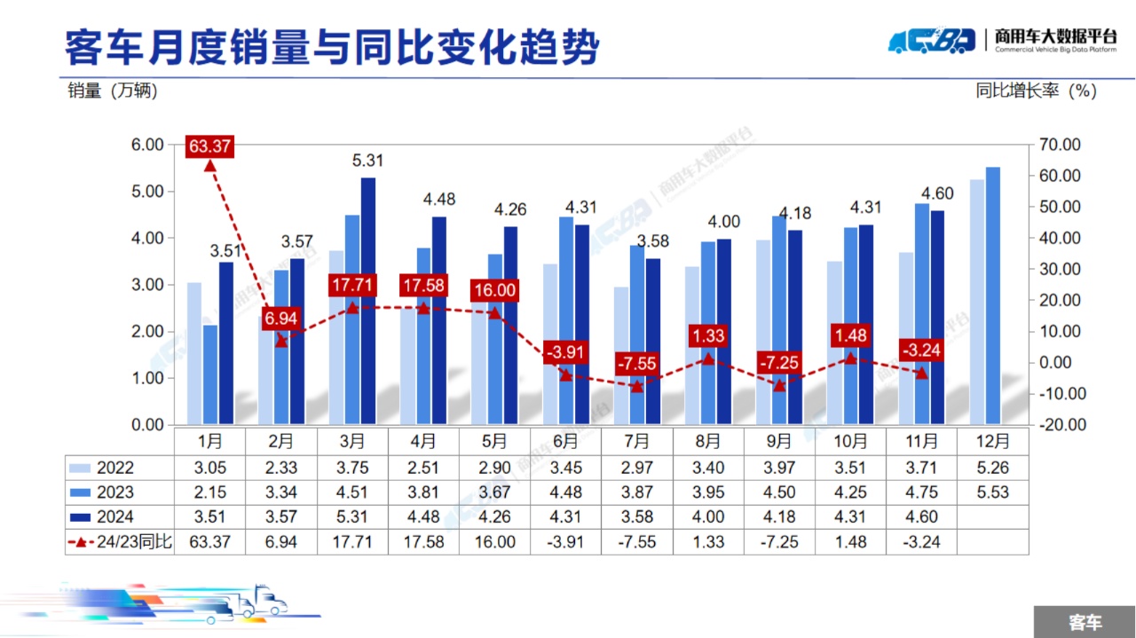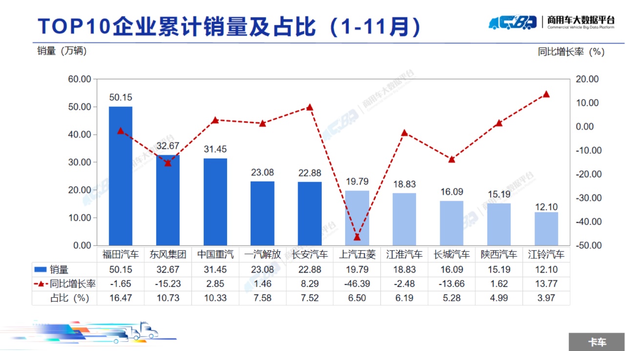 2024年1-11月全国商用车累计销量(批发)为350.53万辆,同比下降4.45%。其中卡车累计销量为304.43万辆,同比下降5.92%;客车累计销量为46.09万辆,同比上涨6.51%。