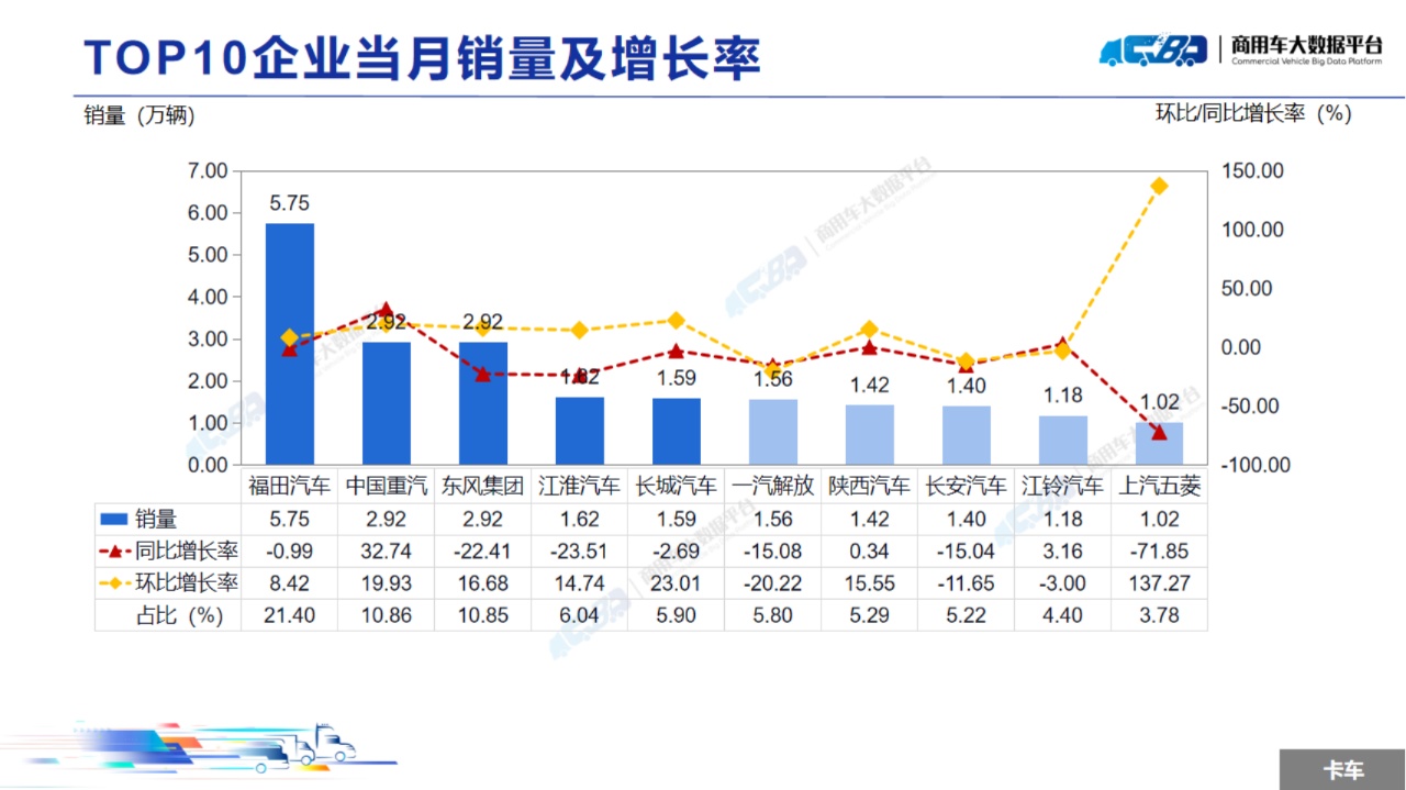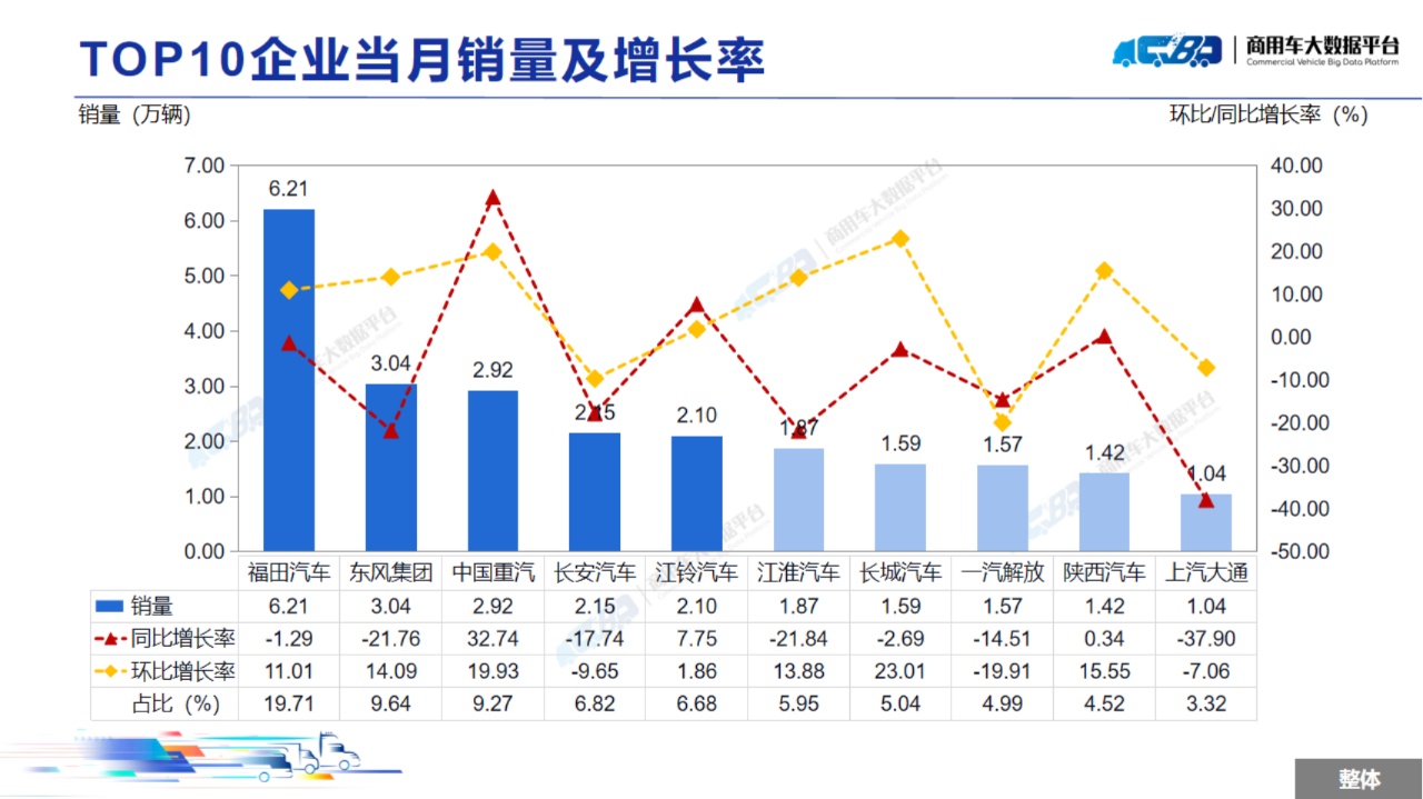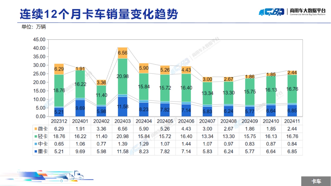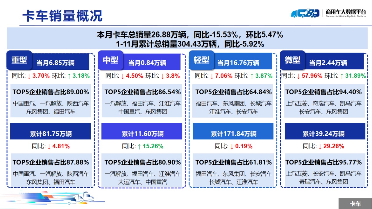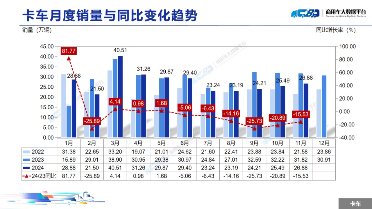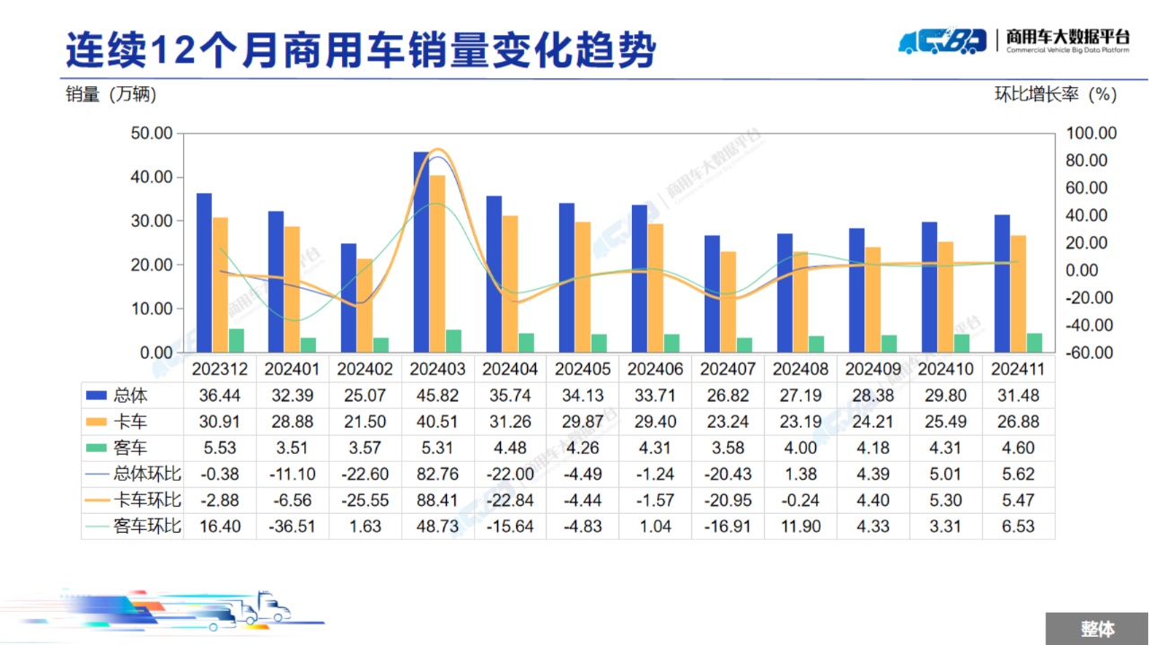 智通财经APP获悉,中国汽车流通协会发文称,2024年11月全国商用车整体销量(批发)为31.48万辆,同比下降13.93%,环比上涨5.62%。其中卡车销量为26.88万辆,同比下降15.53%,环比上涨5.47%;客车销量为4.60万辆,同比下降3.24%,环比上涨6.53%。