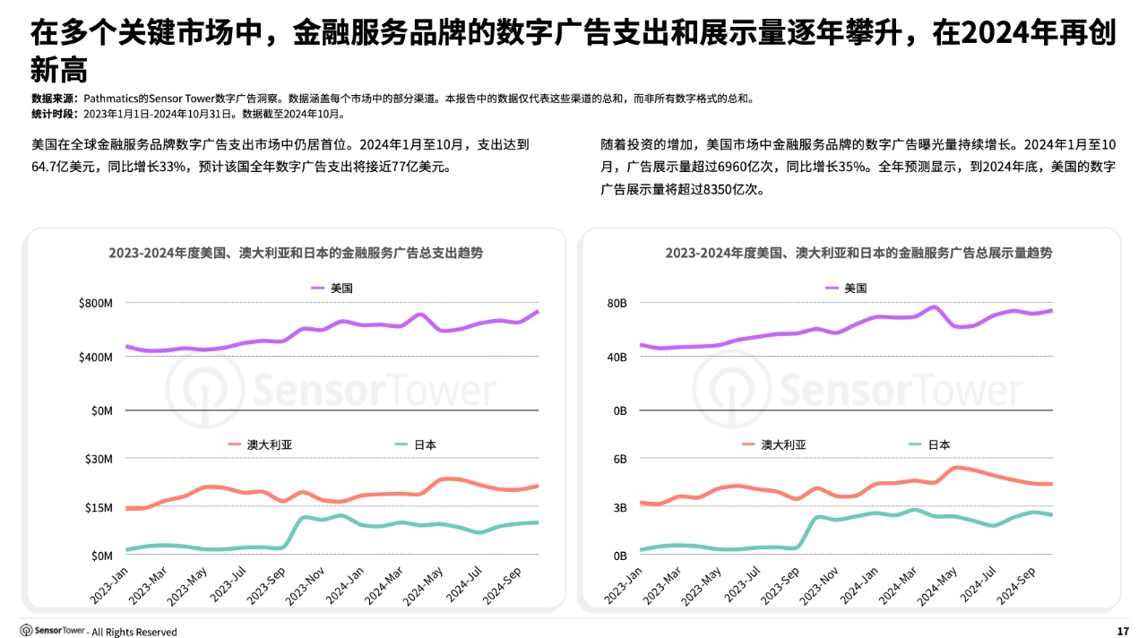在多个关键市场中,金融服务品牌的数字广告支出和展示量逐年攀升,在2024年再创新高