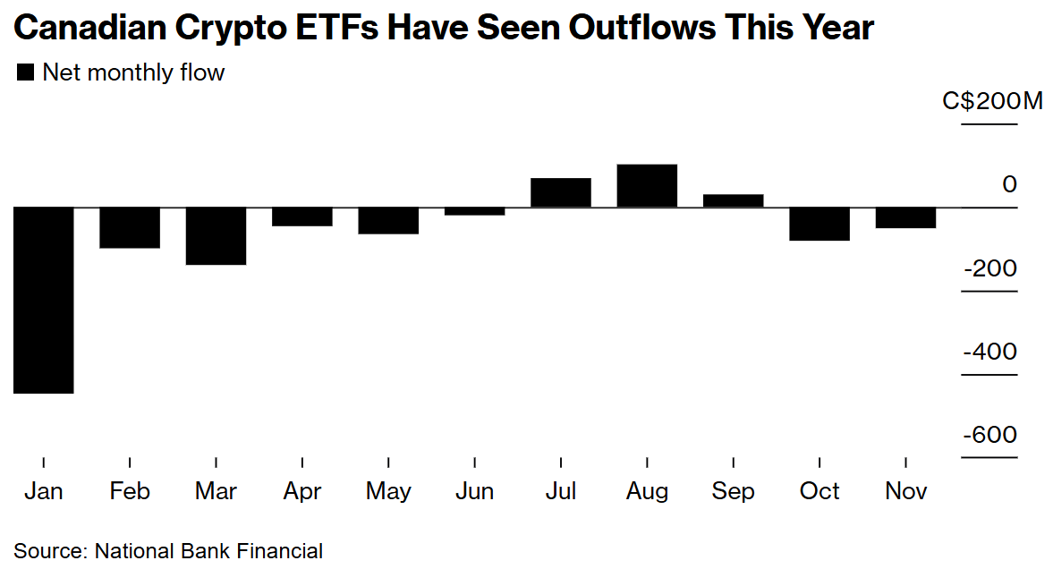 根据道明证券公司汇编的数据,截至 12 月 13 日,今年迄今为止加拿大比特币 ETF 的净流出金额为 5.78 亿加元(4.05 亿美元)。加密货币 ETF 是今年加拿大唯一出现资金流出的 ETF 类别,而截至 12 月 16 日,美国比特币 ETF 的资金流入金额达到创纪录的 360 亿美元。比特币今年以来已飙升逾 150%。