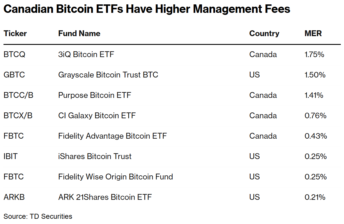 2021 年 2 月,比特币 ETF 在加拿大推出,成为全球首只 ETF。这吸引了来自加拿大和外国投资者的数十亿美元资金,这些投资者希望投资这种原始数字货币。但当美国比特币 ETF 在今年早些时候获得批准时,一些投资者开始重新考虑他们的加拿大加密货币投资。