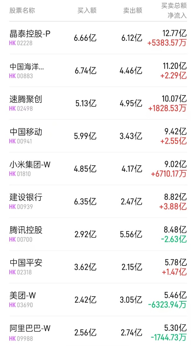 中国移动(00941)获净买入5.84亿港元。消息面上,海通国际指出,市值管理在央企经营中的重视程度将持续不断提升,此次《意见》发布有望进一步推动央企控股上市公司提高市值管理力度、频率、效率,从而推动央企价值更加充分得到市场化体现。长城证券指出,运营商在C端增速放缓的情况下着力H端发展,紧抓千兆发展机遇。在明确的政策预期支撑下,通过融合发展等方式发展千兆业务,我们看好千兆业务通过助推H端业绩成为运营商现阶段业绩增量的重要突破口。稳定的业绩增长保障三大运营商红利属性投资价值。