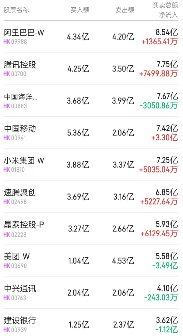 北水净买入最多的个股是中国移动(00941)、建设银行(00939)、中海油(00883)。北水净卖出最多的个股是腾讯(00700)、阿里巴巴-W(09988)、中兴通讯(00763)。