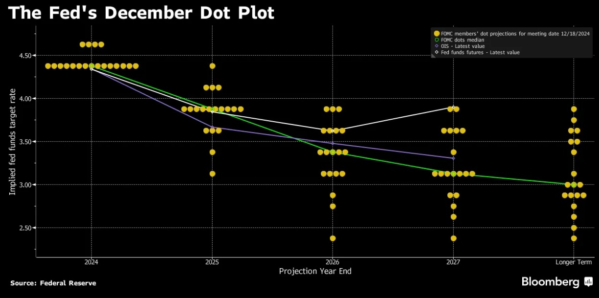 鲍威尔在周三的新闻发布会上强调:“当我们考虑进一步降息时,我们将关注通胀方面的进展。12个月通胀率一直处于震荡走势。”目前,政策制定者的预期中值预计明年的降息幅度将仅为半个百分点,这是9月份预期的一半。