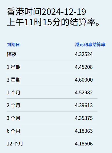 智通财经APP获悉,12月19日,港元拆息几乎全线上升,其中,隔夜息升约3基点至4.32524%,续创近三周新高,而与楼按相关的一个月拆息亦连升四天,报4.52982%,为10月8日以来最高。不过,两个月拆息微跌至4.39613%。