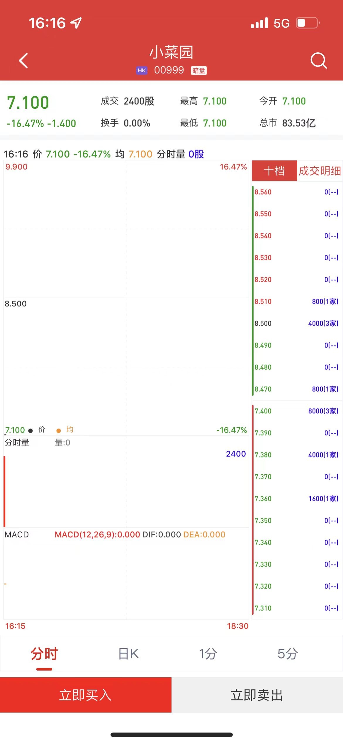 智通财经APP获悉,小菜园(00999)将于12月20日(周五)在香港挂牌。截至发稿,利弗莫尔证券暗盘交易显示报价7.1港元,较招股价8.5港元下跌16.47%,每手800股,不计手续费,每手亏1120港元。
