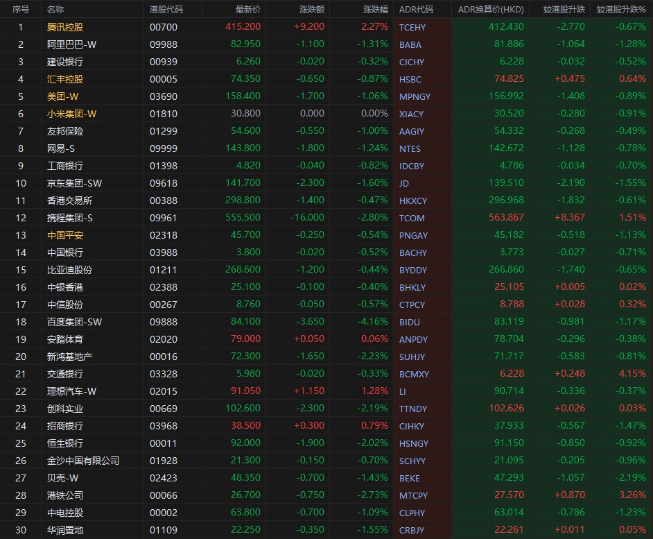 大型蓝筹股多数下跌,汇丰控股收报74.825港元,较香港收市涨0.64%;腾讯控股收报412.43港元,较香港收市跌0.67%。