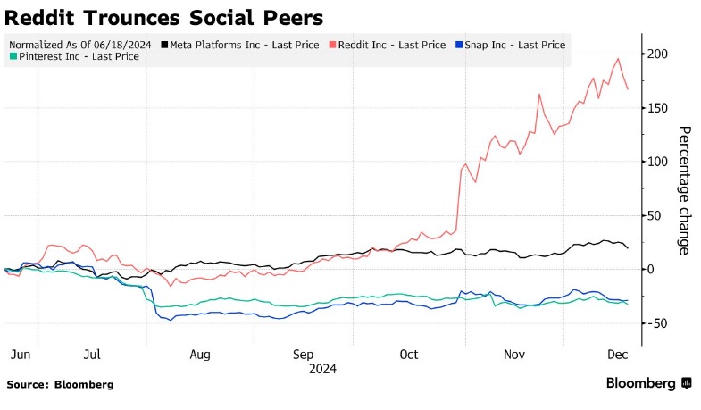 根据摩根士丹利分析师布莱恩·诺瓦克近期发布的研报,过去六个月里,Reddit的股价表现远超Meta及其他社交媒体同行,且在2025年仍有非常宽阔的上涨空间。他于本月早些时候将该股评级上调至“增持”,并表示与AI领军者们达成的训练协议、用户参与度提升和广告举措将继续推动业绩与股价增长。