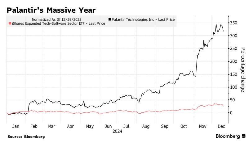 2024年,该公司的股价大幅上涨了332%,市值从年初的370亿美元飙升至当前的近1700亿美元。下周,该科技股将正式加入纳斯达克100指数。意味着将使“AI超级大牛股”Palantir正式进入在全球投资热度颇高的Invesco QQQ Trust ETF(QQQ.US)的股票覆盖范围,该ETF产品追踪纳斯达克100指数。