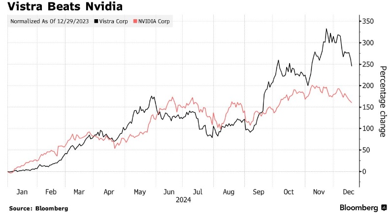 美国电力生产商Vistra Corp.是2024年标普500指数中股票表现最佳的成分股票,涨幅高达256%,甚至超过了英伟达今年迄今高达164%的涨幅。涨幅更加强劲的Palantir则在9月才被纳入标普500指数。