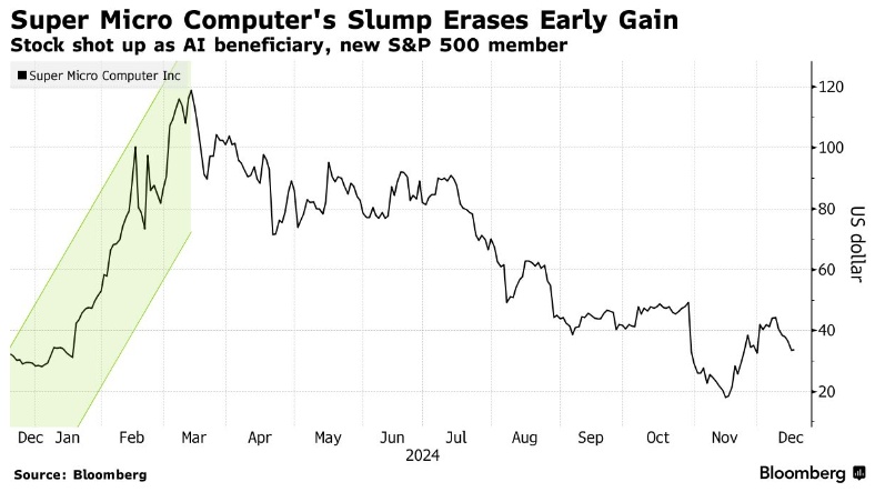 这一年在美股的科技股市场也发生了许多如好莱坞电影般戏剧性的事件,其中最受欢迎的人工智能硬件公司之一同时也是2023年AI超级大牛股之一的超微电脑(SMCI.US)因自身的严重会计问题而导致股价持续暴跌,甚至威胁到其公司能否在美股正常上市交易。