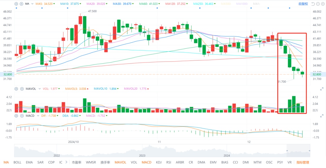 12月17日盘中,康诺亚股价甚至一度下跌至31.7港元,回吐了9月以来的全部涨幅。直至12月19日,康诺亚股价仍未止跌,形成了一波“六连跌”行情。